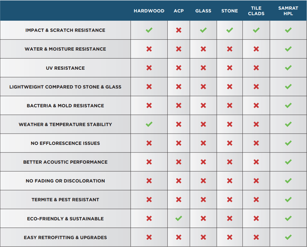 Bekend om zijn sterkte en lange levensduur biedt Samrat HPL uitstekende structurele integriteit en een blijvende uitstraling voor buitentoepassingen.